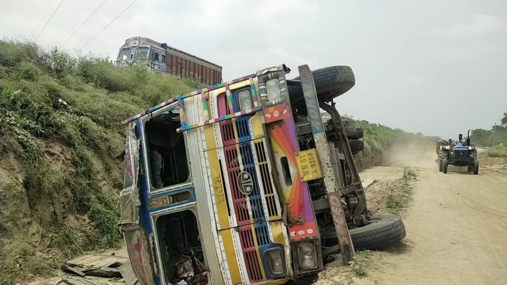 পলাশীগামী খালি লরি শান্তিপুর বাথনাবাইপাস ওভারব্রিজের উপর থেকে রাতের অন্ধকারে 30 ফুট খাদে উল্টে, চালকের মৃত্যু, পলাতক খালাসী