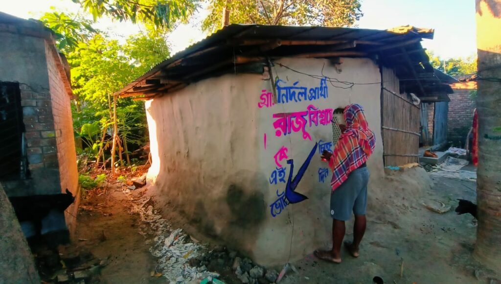 হেভি ওয়েট নেতৃত্ব নেই flex ব্যানার প্রচারের আরম্ভড়তা নেই, এলাকা থেকে চাঁদা তুলে সামান্য কয়েকটি মাটির দেওয়ালে ভুষোকালি গুলে চলছে দেওয়াল লিখন। আমাদের ক্যামেরায় ধরা পড়লো, এমনই চিত্র।