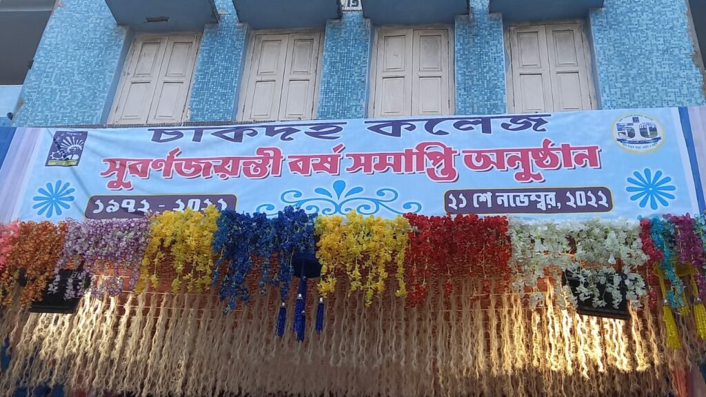 চাকদহ কলেজের ৫০ তম সুবর্ণজয়ন্তী বর্ষ সমাপ্তি অনুষ্ঠান উদযাপন।আজ চাকদহ কলেজ ৫০ তম বর্ষ পূরণ করেছে। আর আজকের এই ৫০ তম বর্ষ পূরণ উপলক্ষে চাকদহ কলেজে অনুষ্ঠিত হচ্ছে সুবর্ণ জয়ন্তী বর্ষ। এ সুবর্ণ জয়ন্তী বর্ষের চাকদহ কলেজে অনুষ্ঠিত হচ্ছে বিভিন্ন ধরনের সাংস্কৃতিক অনুষ্ঠানসহ বিভিন্ন রকম পড়াশুনা বিষয়ক আলোচনা। চাকদহ কলেজের প্রিন্সিপাল ডক্টর স্বাগতা দাস মোহন্ত জানান যে আজকের দিনটিতে তারা কেউ ব্যক্তিগত যানবাহন ব্যবহার করেননি। আশেপাশের ১৩ টি বিদ্যালয় এর প্রাক্তন প্রধান শিক্ষককে আমন্ত্রণ জানানো হয়েছে বিশেষ অতিথি হিসেবে। তিনি আরো জানান আজকের দিনটিকে তারা শুধুমাত্র পঠন পাঠন এর মধ্যে সীমাবদ্ধ না রেখে পরিবেশ সচেতনতা পরিষ্কার-পরিচ্ছন্নতা এবং পড়াশোনা এভাবে পরিকল্পনা করা হয়েছে। বিভিন্ন স্কুলের সাইন্স আর্টস কমার্সের কিছু ছাত্র-ছাত্রীদের ডাকা হয়েছে তারা ল্যাব পরিদর্শন করেছে এবং কুইজ প্রতিযোগিতায় অংশগ্রহণ করেছে। এছাড়াও গয়েশপুর সারদা আশ্রমের সম্পাদিকাকে আমন্ত্রণ জানানো হয়েছে, যার হাতে একটি চেক তুলে দেওয়া হবে সেখানকার অনাথ শিশুদের রক্ষণাবেক্ষণের জন্য। আজকের এই সুবর্ণ জয়ন্তী অনুষ্ঠানে উপস্থিত ছিলেন চাকদাহ রামলাল একাডেমীর প্রাক্তন প্রধান শিক্ষক বিপুল রঞ্জন মহাশয়। দূষণমুক্ত পরিবেশ গড়ার লক্ষ্যে চাকদাহ কলেজ পরিবারের পক্ষ থেকে আজকের দিনটিকে No Vehicle Day হিসাবে পালন করা হয়েছে।