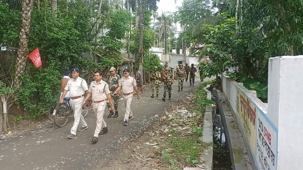 চাকদা থানার পুলিশের উদ্যোগে এনায়েতপুরে পুলিশ ও কেন্দ্রীয় বাহিনীর রুট মার্চ