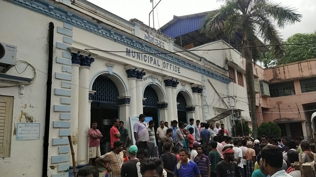 তৃণমূল পরিচালিত শান্তিপুর পৌরসভার গেট আটকে বিক্ষোভ আইএনটিটিইউসির
