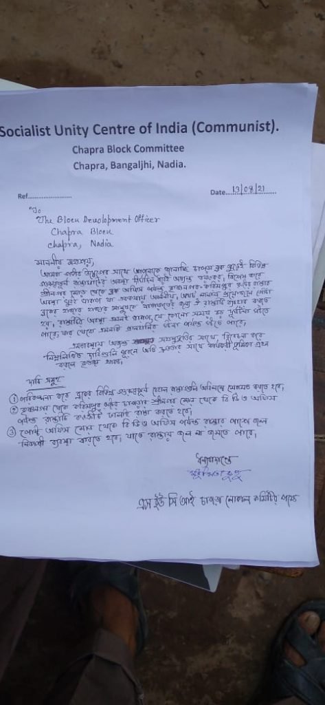 মলয় দে নদীয়া:- আজ এস ইউ সি আই কমিউনিস্ট দলের চাপড়া লোকাল কমিটির পক্ষ থেকে চাপড়া ব্লক এর সমস্ত বেহাল রাস্তা অবিলম্বে মেরামত করার দাবিতে এবং কৃষ্ণনগর করিমপুর রোড এর সিনগর মোড় থেকে বিডিও অফিস পর্যন্ত কংক্রিট ঢালাই রাস্তার দাবিতে এবং চাপড়া বাজারে রাস্তায় যাতে জল জমতে না পারে তার জন্য নিকাশি ব্যবস্থা করার দাবিতে চাপড়া ব্লক অফিসে বিক্ষোভ ও বিডিও কে ডেপুটেশন দেওয়ার কর্মসূচি নেওয়া হয়। বিক্ষোভ কর্মসূচি হলেও বিডিও ডেপুটেশন নিতে অস্বীকার করেন। বিডিও এই আচরণকে ধিক্কার জানিয়ে বিক্ষোভ সভা অনুষ্ঠিত হয়। সভায় চাপড়া লোকাল কমিটির ইনচার্জ মধুমিতা কুন্ডু বলেন এক মাসের মধ্যে বেহাল রাস্তা সরানো না হলে রাস্তা অবরোধের মধ্য দিয়ে শক্তিশালী আন্দোলন গড়ে তোলা হবে বলেই জানান সংগঠনের পক্ষ থেকে।