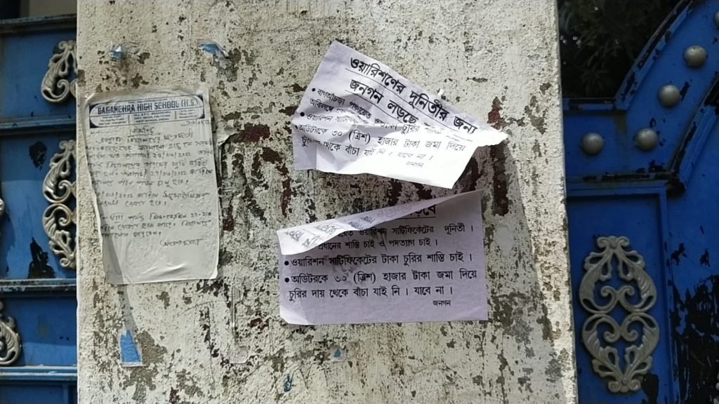 ওয়ারিশন সার্টিফিকেট নিয়ে দুর্নীতির অভিযোগ প্রধানের বিরুদ্ধে, রাতের অন্ধকারে এইরকমই বেশ কিছু পোস্টার ছেয়েছে শান্তিপুর ব্লকের বাগআঁচড়া পঞ্চায়েত এলাকায়। বাদ যায়নি বাগআচড়া উচ্চ বিদ্যালয়ের গেট, বাস স্ট্যান্ড এমন কি পঞ্চায়েত অফিসের দেওয়ালও। ওয়ারিশন দুর্নীতি ঠেকাতে যে অডিটর এসেছিলেন তাকেও নাকি ৩০ হাজার টাকা দেওয়া হয়েছে এমনও অভিযোগ,করে বিভিন্ন দেওয়ালে পোস্টার লাগানো হয়। ওই পোস্টারে আরও লেখা হয়েছে, দুর্নীতি যুক্ত প্রধানের পদত্যাগ এবং শাস্তি চাই।