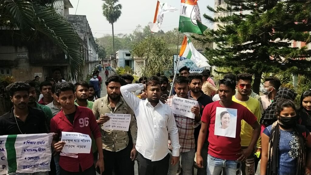 বারাণসীতে মুখ্যমন্ত্রীকে কালোপতাকা দেখানোর প্রতিবাদে তৃণমূল ছাত্র পরিষদের পক্ষ থেকে ছাত্র-ছাত্রীদের অবস্থান-বিক্ষোভ গোটা জেলা জুড়ে