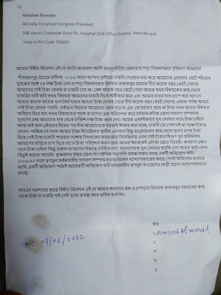 চাপড়া ব্লকের বিভিন্ন এলাকা থেকে ছয় লক্ষ টাকা করে চাকরির মিথ্যা প্রতিশ্রুতি দিয়ে টাকা তুলেছেন বলে অভিযোগ করলেন অভিযোগকারীরা । চাপড়া এলাকার একাধিক মানুষের দাবি রুকবানুর রহমান ও তার ছায়াসঙ্গী শুকদেব ব্রহ্ম হাতে টাকা দিয়েছেন। চাপড়ায় এলাকার মানুষের কাছ থেকে চাকরির প্রতিশ্রুতি দিয়ে লক্ষ লক্ষ টাকার আর্থিক তছরুপের অভিযোগ ওঠে। বিধায়ক ২০১৬ আপার প্রাইমারিতে চাকরির হবে বলে জানিয়ে যাদের কাছ থেকে টাকা নিয়েছিলেন চাকরি না মেলায় টাকা ফেরত এর দাবি করেন । বাড়ির ছেলেদের চাকরি হওয়ার জন্য জমি বাড়ি বেচেও অনেকে টাকা দিয়েছেন কিন্তু বিগত ছয় বছর কেটে গেলেও আজও তারা টাকা ফেরত পাননি তাই অবশেষে তারা অভিষেক বন্দ্যোপাধ্যায়ের কাছে চাপড়া বিধানসভা কেন্দ্রের বিধায়ক রুকবানুর রহমান বিরুদ্ধে একটি চিঠি পাঠান।