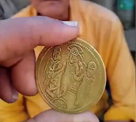 মাটির নীচে গুপ্তধন ২০০ বছরের প্রাচীন স্বর্ণ মুদ্রা, অষ্টধাতুর মূর্তি,মাটি খুঁড়তেই সন্ধান মিলল গুপ্তধনের। মাটি খুঁড়তে পাওয়া গেল ২০০ বছরের প্রাচীন স্বর্ণ মুদ্রা। তবে শুধুমাত্র মুদ্রায় নয় এর সাথে পাওয়া গেল একটি অষ্টধাতুর মূর্তি। ঘটনাটি ঘটেছে উলুবেরিয়া পুরসভার ৫ নং ওয়ার্ডের বাউরিয়া ভাষাপারায়। ওই এলাকার বাসিন্দা, রবিন হাজরার বাড়িতে সংস্কারের কাজ চলছিল। আর মাটির নিচ থেকেই ১৮১৮ সালের প্রাচীন এই স্বর্ণ মুদ্রা পাওয়া গেল। এই স্বর্ণ মুদ্রাটিরে একদিকে রাম লক্ষণ সীতার ছবি আছে এবং অন্য দিকে লেখা আছে ইউকে ওয়ান আনা আর এই মুদ্রাটির নিচে উল্লেখ করা আছে ১৮১৮ সালের। স্থানীয় এক স্বর্ণকারের দাবি মুদ্রাটি সোনার। প্রশাসন যদি চায় তবে এই মুদ্রাটি ওই ব্যক্তি প্রশাসনের হাতে তুলে দিতে রাজি আছেন। প্রাচীন এই মুদ্রা থেকে ইতিহাস সম্পর্কে অনেক কিছু জানা যেতে পারে বলে জানাচ্ছেন ওই স্বর্ণ ব্যবসায়ী।