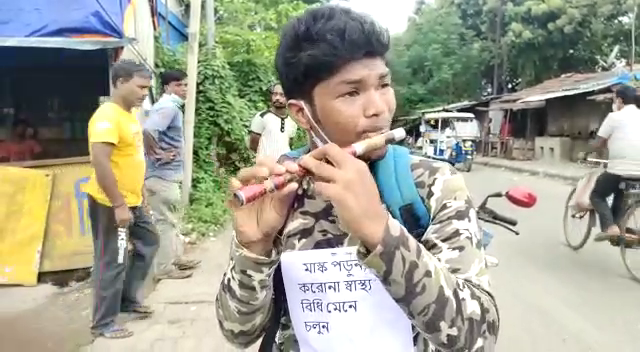 মাস্ক পড়ুন, সুস্থ থাকুন।দির্ঘ পথ সাইকেল চালিয়ে এবং বিভিন্ন বাজার ও রাস্তার মোড়ে দাঁড়িয়ে বাঁশির সুরে প্রচার করছে করোনা প্রতিরোধে সকলে যাতে সরকারি নিয়ম মেনে চলে,ও মাস্ক যাতে সকলে পরে পাশাপাশি করোনা স্বাস্হ্য বিধি মেনে চলে।এই ছাত্রর নাম দেবজিৎ দাস একাদশ শ্রেণীর ছাত্র। নদীয়া জেলার খালপার এলাকার বাসিন্দা সে, তার স্বপ্ন সে একদিন নিজেকে প্রতিষ্ঠিত করবে।