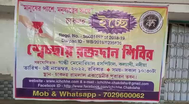 স্বেচ্ছাসেবী সংস্থা ইচ্ছের পক্ষ থেকে রামলাল একাডেমিতে অনুষ্ঠিত হল ‘স্বেচ্ছায় রক্তদান শিবির’।আজ চাকদহ রামলাল একাডেমির মুক্তমঞ্চে স্বেচ্ছাসেবী সংস্থা ইচ্ছের পক্ষ থেকে আয়োজন করা হয়েছিল স্বেচ্ছায় রক্তদান শিবির। যেখানে প্রায় ৫০ জনেরও অধিক মানুষ স্বেচ্ছায় রক্তদান করেছে। এই নিয়ে ইচ্ছে স্বেচ্ছাসেবী সংস্থার পক্ষ থেকে সপ্তম বার এই শিবিরের আয়োজন করা হয়েছে। এ রক্তদান শিবিরে উপস্থিত ছিলেন ইচ্ছে স্বেচ্ছাসেবী সংস্থার সম্পাদক সহ অন্যান্য সদস্যরা। ইচ্ছে সদস্যরা জানালেন বর্তমানে একজনের রক্ত দিয়ে তিন জন মানুষকে বাঁচানো যায়। তাই প্রতিবছরই এই রক্তদান শিবিরের আয়োজন করা হয়। মানুষ অত্যন্ত সাড়ম্বরে এই রক্তদান শিবিরে উদ্যোগে সাড়া দিয়েছেন। ইচ্ছের সদস্যরা জানালেন মানুষ তাদের পাশে না থাকলে তারা আজ এতদূর এগোতে পারতেন না তাই আগামী দিনেও তারা এরকম কর্মসূচি করে যাবে।