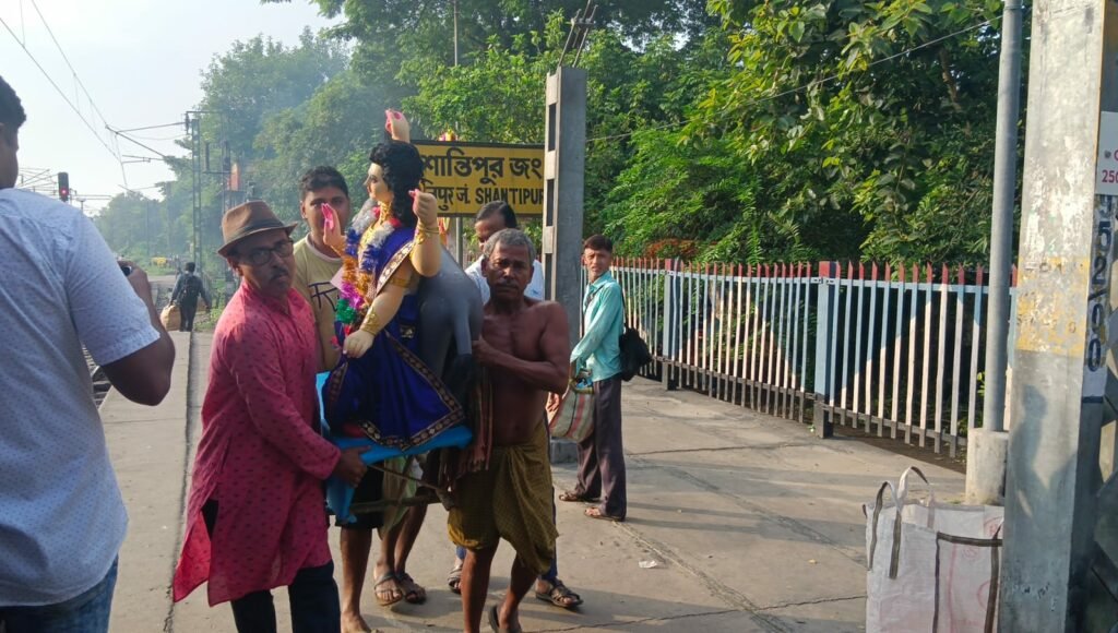 আপনাদের সঙ্গে কথা বলতে বলতে প্লাটফর্মে ঢুকে গেছে ট্রেন। শান্তিপুরের সদস্যরা প্রতিমা পুজোর উপকরণ ট্রেনে তুলতে ব্যস্ত তৎপর ট্রেনের সামনে মাঙ্গলিক কলা গাছ ফুলের মালা লাগাতে। ঢাকি বাজাচ্ছেন ঢাক। এরই মাঝে সমগ্র ট্রেন যাত্রী একবার করে জানালা দিয়ে উঁকি দিয়ে প্রণাম করে যাচ্ছেন বিশ্বকর্মা কে। নিত্যযাত্রীরা যে যার নির্ধারিত কম্পার্টমেন্টে গেলেও আগ্রহী বেশ কিছু ক্যাজুয়াল প্যাসেঞ্জার পুজো দেখতে দেখতে যাবেন বলে ভিড় করেছেন এই কম্পার্টমেন্টেই। ইতিমধ্যেই ট্রেন ছাড়ার সবুজ সংকেত জ্বলে উঠেছে, স্টেশন মাস্টার রেল কর্মী আরপিএফ কর্মকর্তা থেকে শুরু করে প্রত্যেকের উপহার-মিষ্টি পৌঁছে দিয়ে সকলেই হুড়মুড়িয়ে উঠে পড়েন ট্রেনে।