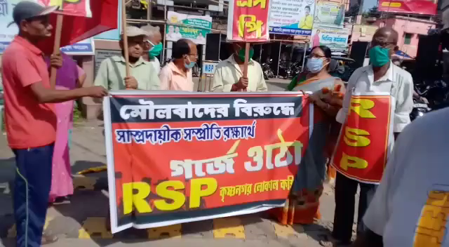 মলয় দে নদীয়া:- ধর্ম যার যার দেশ সবার এমনই উক্তি নিয়ে আরএসপি নদিয়া জেলা কমিটির পক্ষ থেকে এক মিছিল সংঘটিত করা হয় পোস্ট অফিসের মরে। তাদের উদ্দেশ্য মৌলবাদের বিরুদ্ধে সাম্প্রদায়িক সম্প্রীতি বজায় রাখার পক্ষে। এদিন আরএসপি এর নদীয়া জেলা কমিটির সম্পাদক সন্তশ সরকার বলেন রাজ্য কমিটির নির্দেশে তারা পথে নেমেছে সন্ত্রাসের বিরুদ্ধে। তিনি আরো বলেন রাজ্যের তৃণমূল সরকার ও কেন্দ্রের বিজেপি সরকার তারা কোন না কোনভাবে এই সাম্প্রদায়িক শক্তিকে মদদ দিচ্ছে এবং দেশের সার্বভৌমত্ব নষ্ট করার চেষ্টা করছে, শুধুমাত্র বেকারত্ব, জিনিসপত্রের আকাশছোঁয়া মূল্যবৃদ্ধি,এইসব সমস্যা থেকে মানুষের দৃষ্টিভঙ্গি ঘোরানোর জন্য।